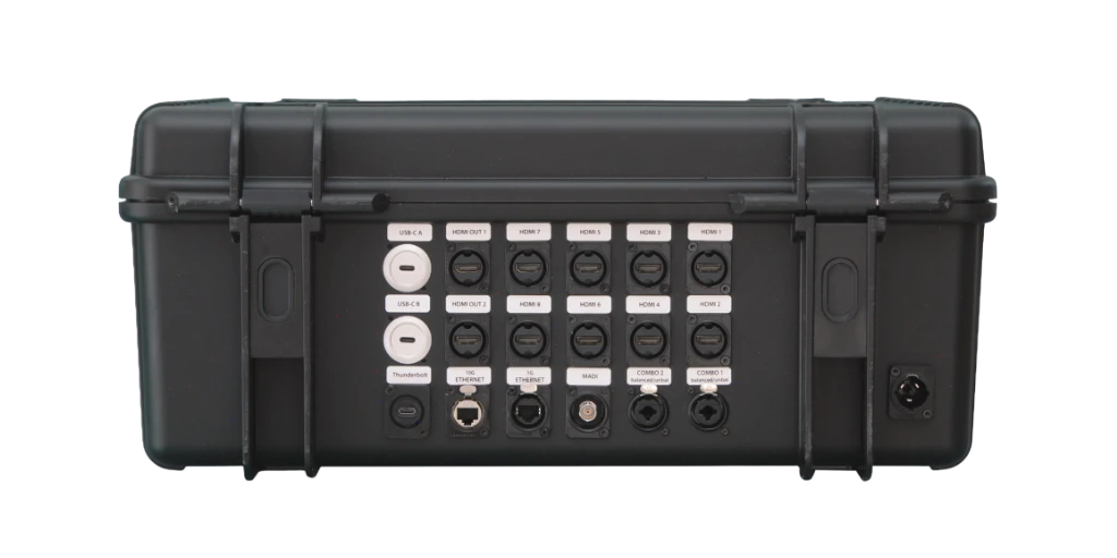 Dieses Setup vereint Video- und Audioverarbeitung in einer Qualität und Kompaktheit, die in dieser Klasse einmalig ist. Alle Schnittstellen sind genau dort, wo du sie brauchst: Audio-Inputs und Monitoring- und Serviceports links, MADI-Erweiterung hinten.